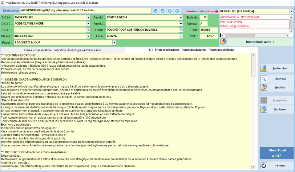 cliquant sur le bouton [Base Méd.], de même que consulter ses principales interactions.