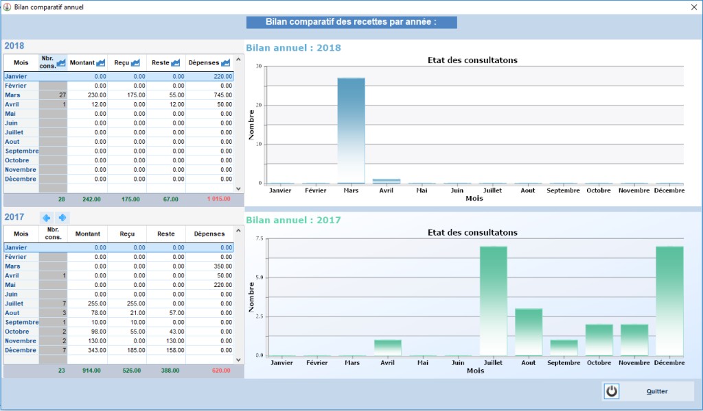Ce formulaire permet de rendre compte de l’évolution des recettes de l’année en cours et de la comparer aux années précédentes et ainsi d’avoir une estimation sur l’évolution du cabinet.