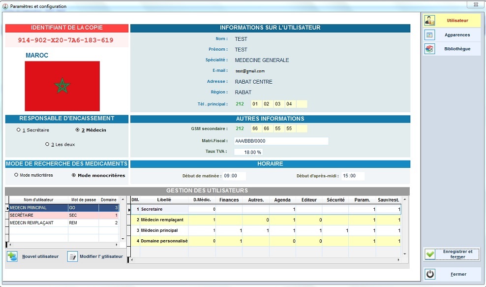 Ce formulaire permet de paramétrer les données permettant d’identifier l’utilisateur. Il permet aussi d’initialiser certaines données concernant le cabinet, dont l’horaire des consultations pour les RDV.