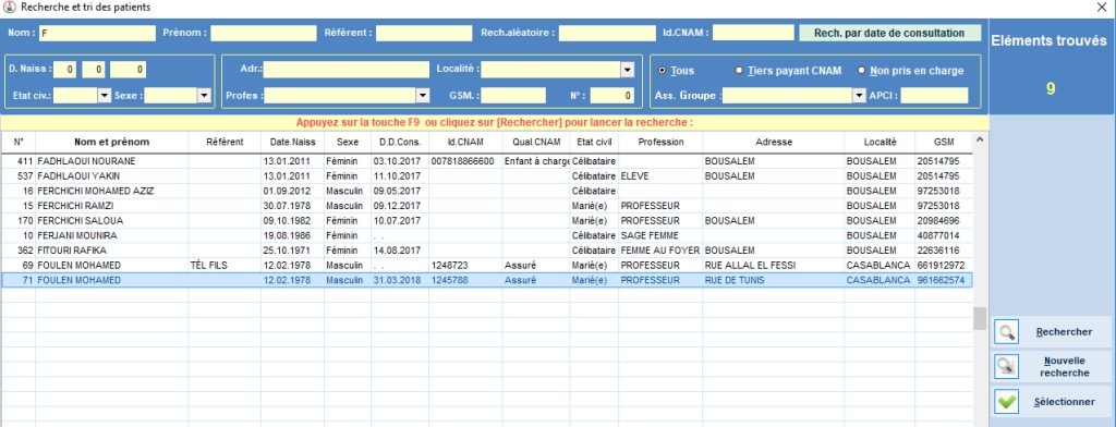 Pour lancer la recherche, il faut introduire dans les champs de saisie certains des éléments d’identification de votre patient, puis faites F9 pour lancer la recherche, puis sélectionnez votre patient par ENTREE