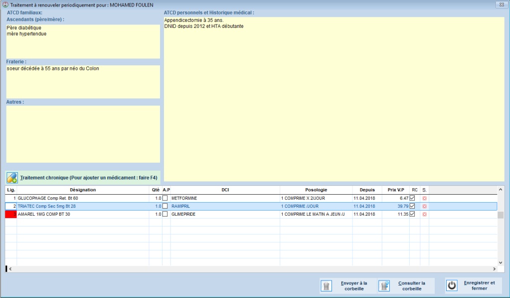 Pour accéder au formulaire de saisie des différents ATCD du patient (Familiaux et personnels) et du traitement renouvelable.